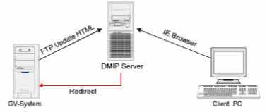 If your GV-System is using a dynamic IP address then it is nearly impossible for WebCam users to locate your GV-System once its IP address changes. DMIP is exclusive developed application for solving such problem. DMIP utilizes standard File Transfer Protocol (FTP) to upload files or data to a designated file server. This allows IP address of the GV System to be transferred to the file server periodically. You can now logon to the file server instead of GV System, file server will further redirect WebCam viewer to the GV-System.
