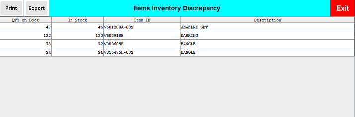 A sample of discrepancy report screen shot from the physical inventory compares to quantity on book. The report can be printed or exported to file for further check ups. | ||||||