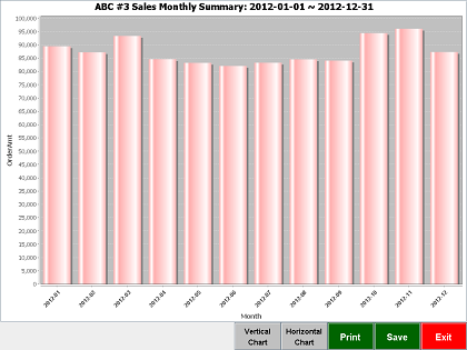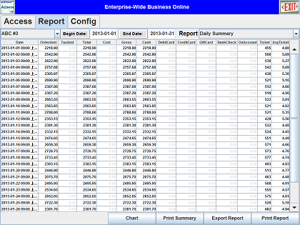 The daily operation reports, like daily, weekly, monthly, quarterly or specified duration sales revenue, can be remotely accessed from multiple buiness store locations at office desk. The data then be printed or exported for other business purposes. Here are the daily sales report table and monthly sales report bar chart |